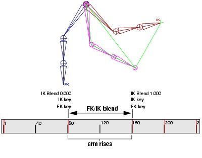 You can pose and animate the joints of a joint chain using both Fk and IK. This is called animation blending. This blending between FK and IK animation is possible because of the IK handle's Ik Blend attribute. Ik Blend lets you switch between posing and animating with pure FK or pure IK, as well as control the blend between the two kinds of animation. See Ik Blend.