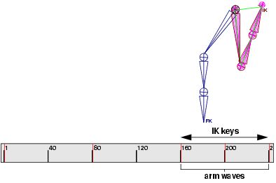 This FK animation sequence is blended with the directed motion of the arm waving by setting keys on the IK handle and the shoulder joint at the beginning and end of the FK animation, moving the current time indicator to create a blend region, changing the Ik Blend value to 1.000 (pure IK), and once again setting keys on the shoulder joint and IK handle. In the area between the pure FK and IK animation—the blend region, the IK Solver interpolates the animation from 0.000 to 1.000.