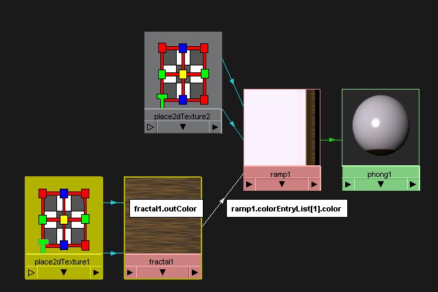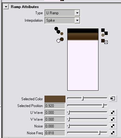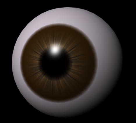 In this example, a simple eyeball shader is created using a ramp. A fractal is created with repeats set to 3 and 6.5 to give it the stretched out appearance. Color offset in the fractal was adjusted for the brown shades. The fractal is then connected to the color entry on the ramp just after the black pupil color. Using a gradient transition the fractal blends into a solid brown color. To keep sharp transition from the pupil to the iris, and iris to white surface, additional color entries are added to the ramp and positioned very close together.