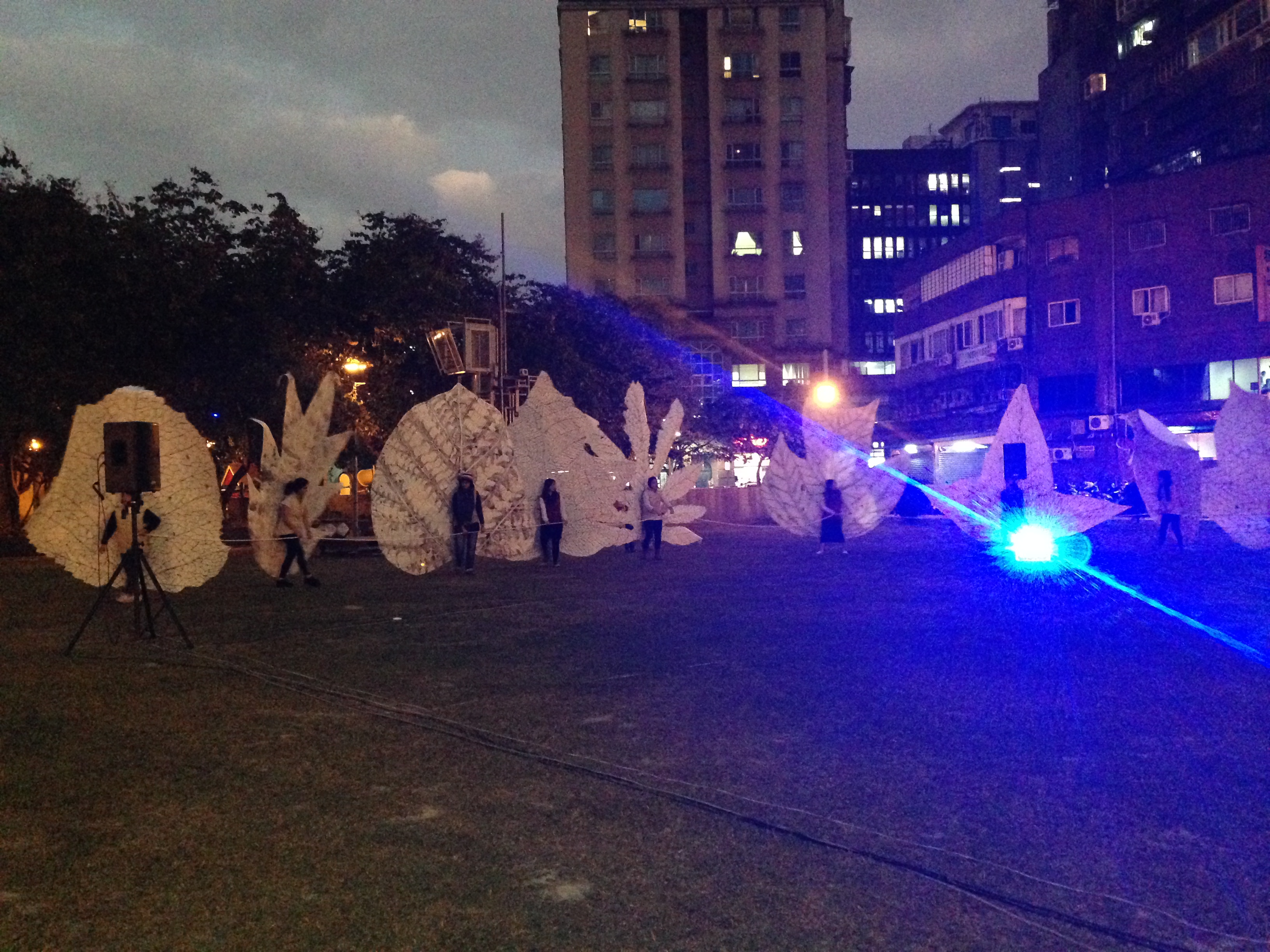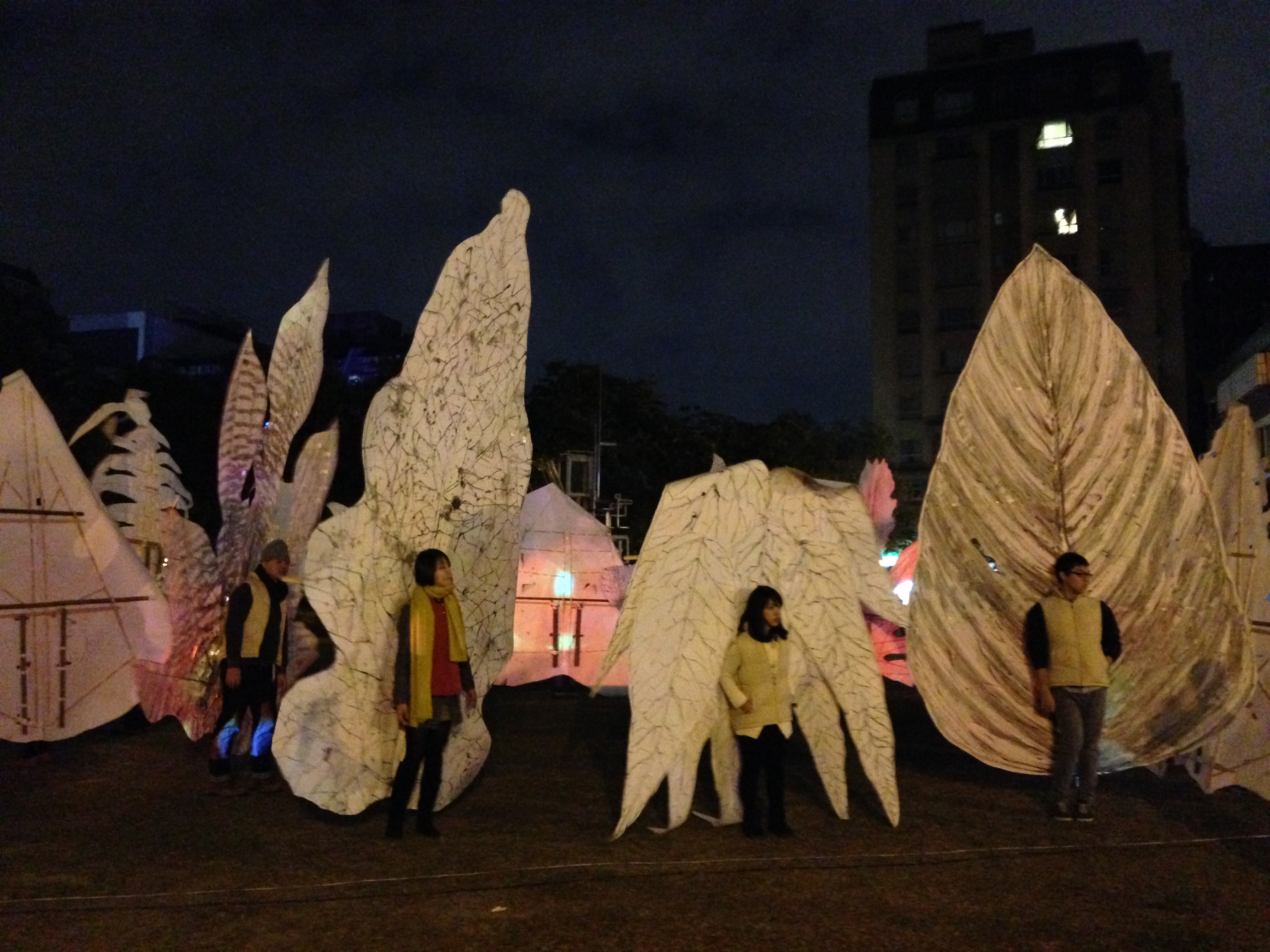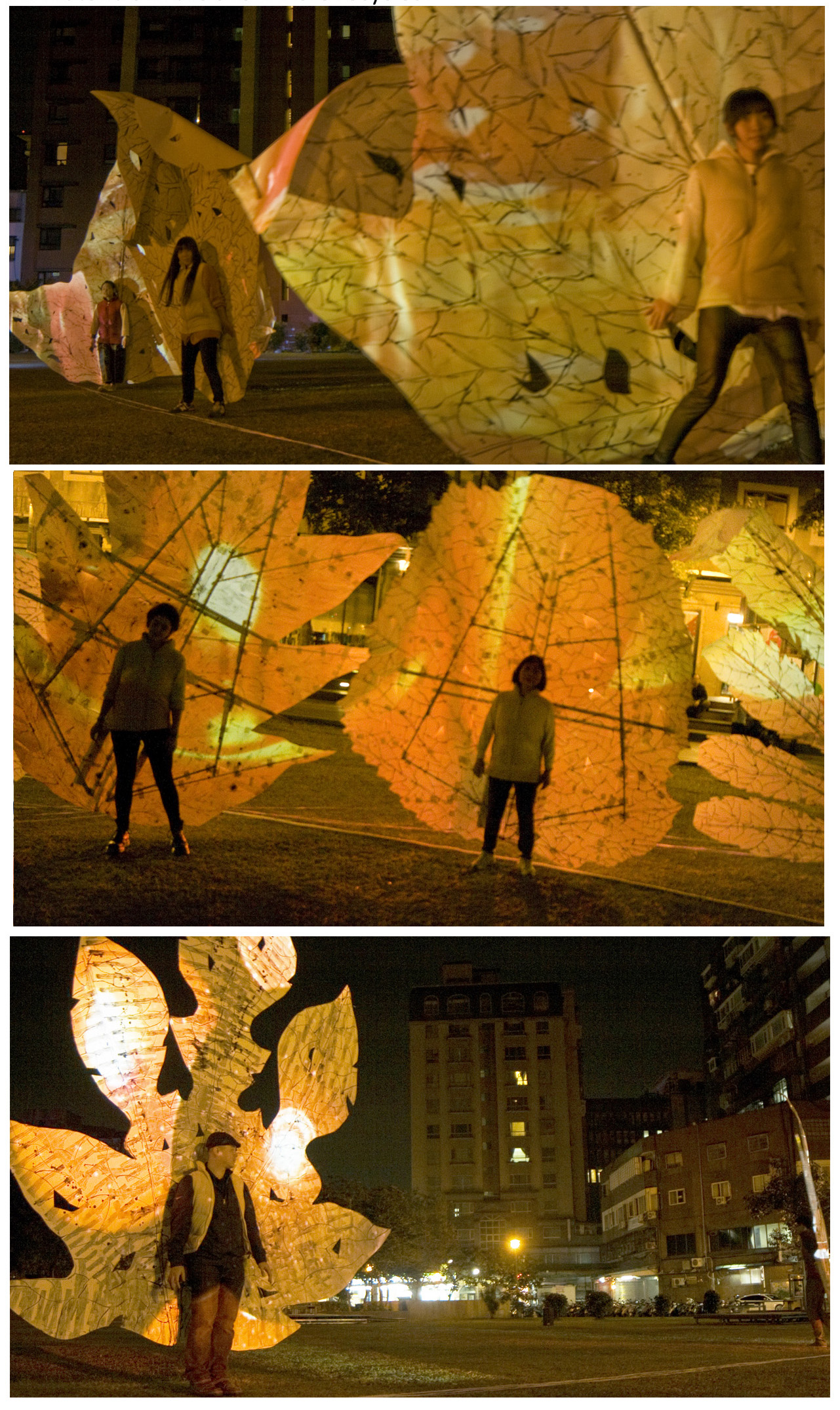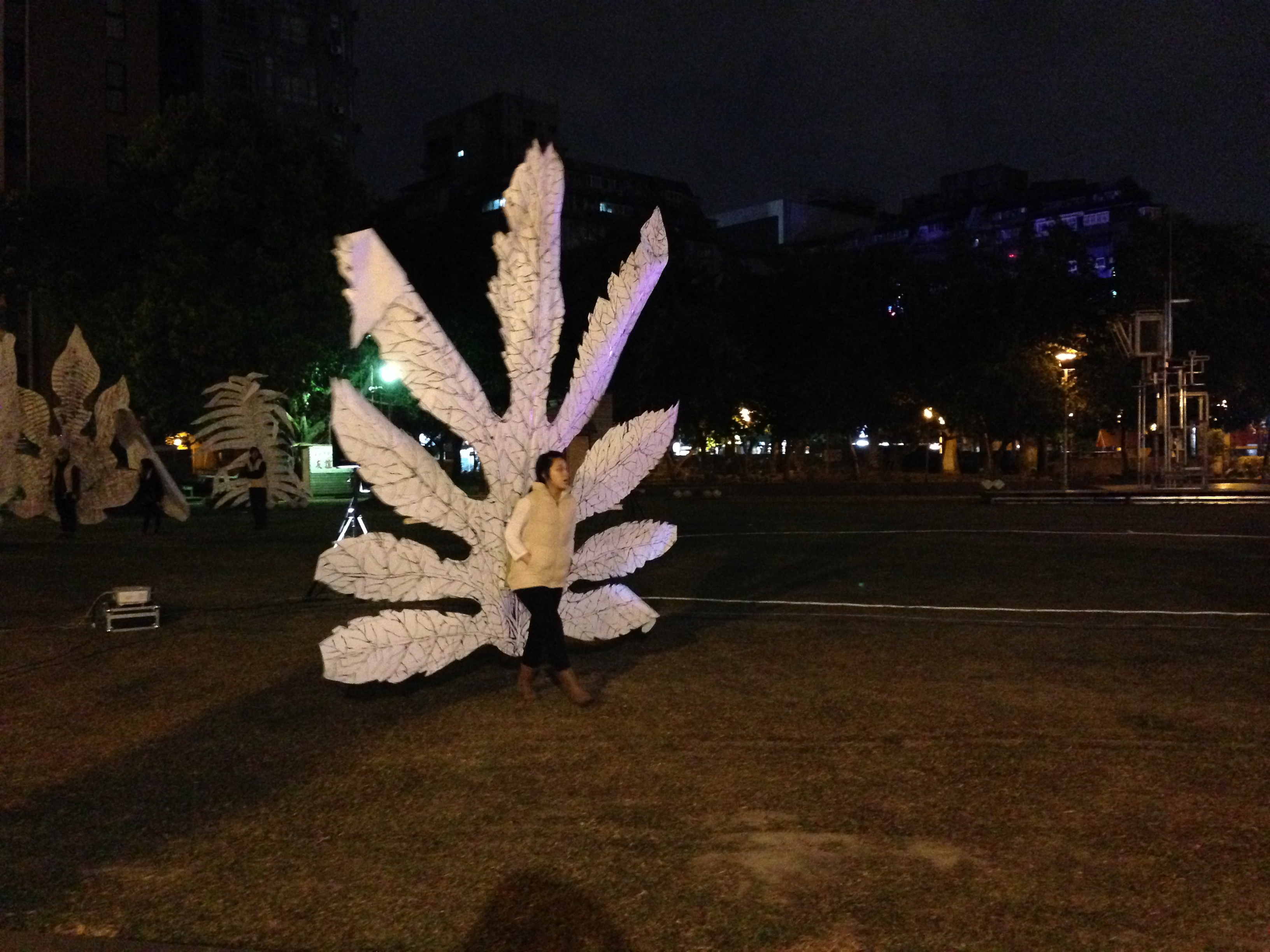 The final performance featured a sequence timed to composed music (played live by local musicians the Dronetonics) . The performance took place in the large courtyard park of the CSCH Art Center in central Taipei. Similar to the Osani Circle Game children play in central Africa (Efé children of the Ituri Forest in Zaire), each volunteer wore a leaf which ended in a conjoined circle, as if making a consolidated crown in a ceremonial act as in a coronation. The performance began before twilight, and as the night progressed, video of candle flames were projected on the translucent paper of the 'leaves" as they paraded. The multi-media performance heightened the idea of impermanence and belief in community, kinship, and preservation. 100 percent of the materials used in this project were recycled.
