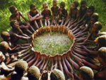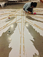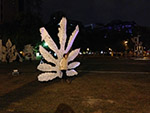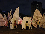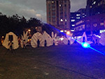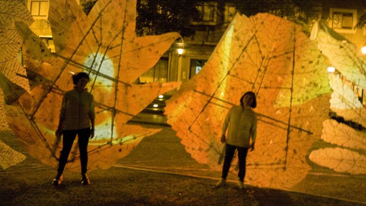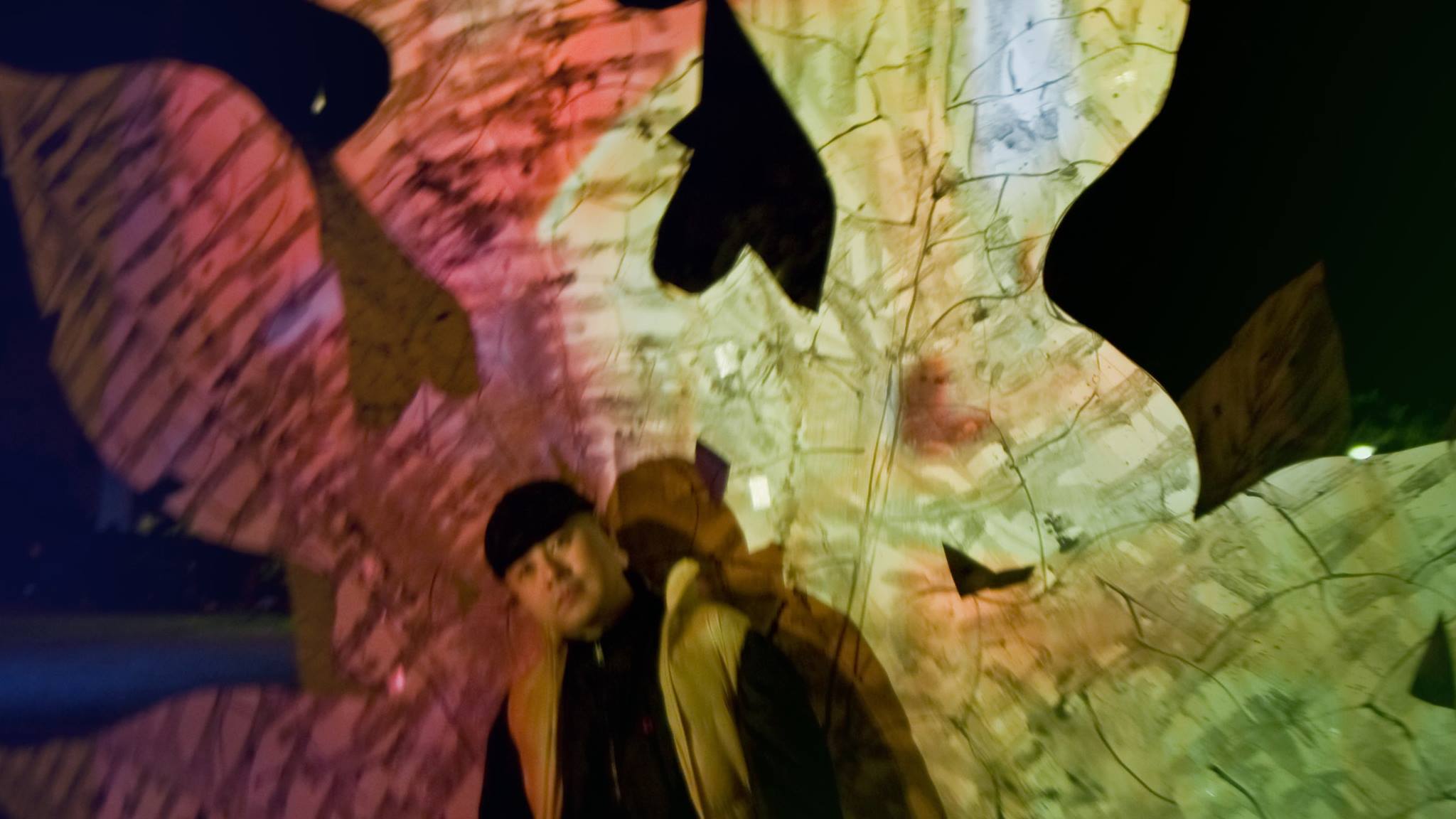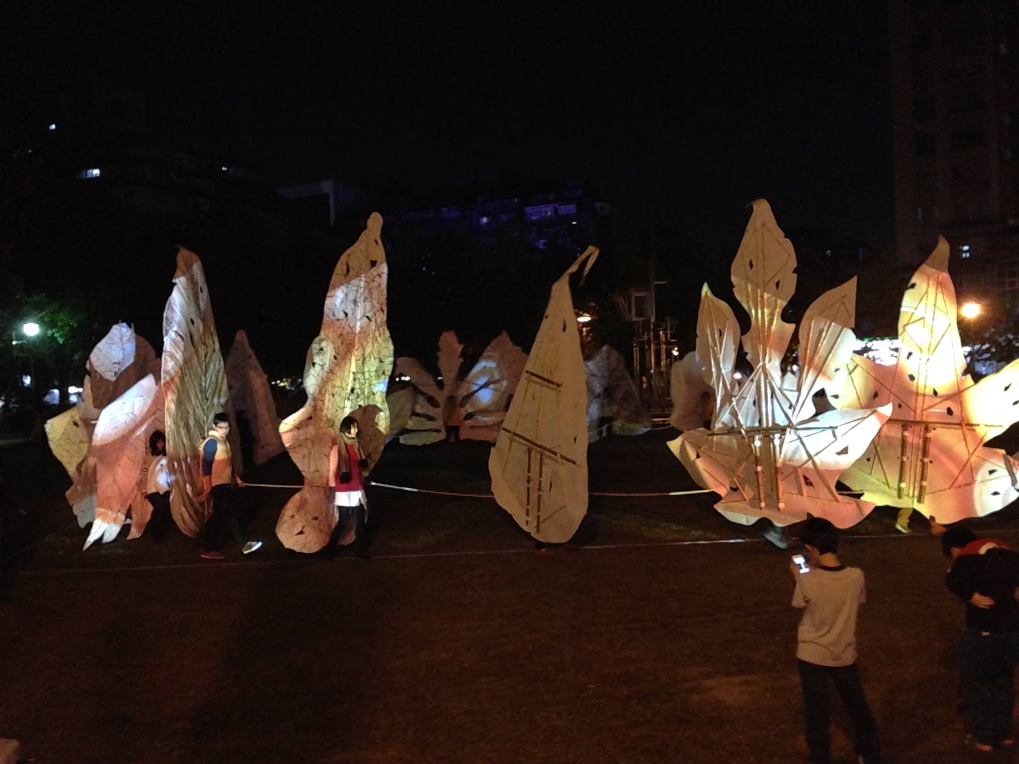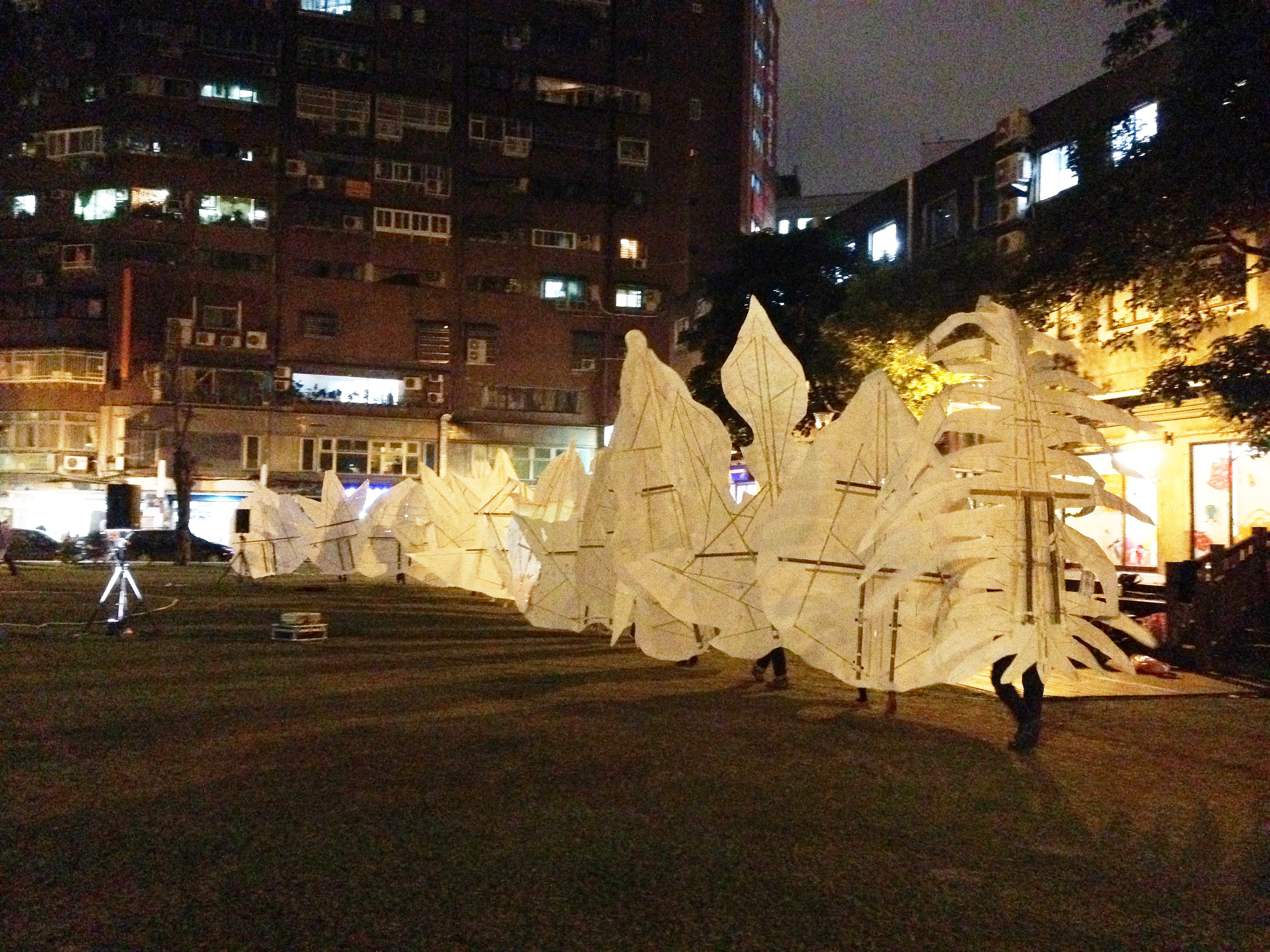 The final performance featured a sequence timed to composed music (played live by local musicians the Dronetonics) . The performance took place in the large courtyard park of the CSCH Art Center in central Taipei. Similar to the Osani Circle Game children play in central Africa (Efé children of the Ituri Forest in Zaire), each volunteer wore a leaf which ended in a conjoined circle, as if making a consolidated crown in a ceremonial act as in a coronation. The performance began before twilight, and as the night progressed, video of candle flames were projected on the translucent paper of the 'leaves" as they paraded. The multi-media performance heightened the idea of impermanence and belief in community, kinship, and preservation. 100 percent of the materials used in this project were recycled.