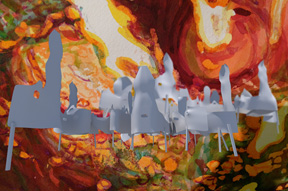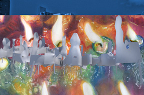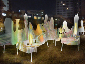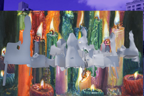 "Coronator" is a mixed media paper sculpture and video projection project that brings together imagery of beautiful colorful illusions of melting and burning wax candle animation, and dynamic mobile improvised paper sculpture. I will use white construction paper, inexpensive recycled paper, newsprint, and any white papers that I can find and recycle during my 3 month stay in Taipei. The temporary and organic nature of the materials works into the idea. I arrive in Taipei in November. During my stay, I will begin making light paper sculpture that will resemble a long serpentine train. The shape and length of the entire piece is determined practicality, and has an organic and abstract non-objective form. However the rising peaks can resemble licks of flames. The paper will be reinforced by pine or bamboo sticks, that both support the structure off the ground, and can be picked up and carried, and "animated' by a person or people. The images that I will project on the paper during evening/night hours, will be of watercolor paintings of flames, candles and melting wax. There may also be a sound element as well..  |