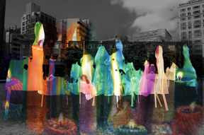 "Coronator";..although this is not an English word, the meaning of the title and the piece "coronator" was influenced from two sources. One from the word "coronation" which refers to the ceremony for crowning a member of a monarchy. The is an organic resemblance to a "crown" with the form of the sculpture and projection. Secondly "coronator" has a similar sound to "coroner", which is a an judicial official that investigates the causes of death. There is an idea of magical revival, and warning of destruction, and dissolution in one work. The result of the work and projections and performance, can be left to be determined in length and number of participants.  |